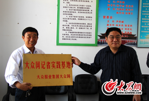 [提要] 大眾網總編輯朱德泉將兩塊印有“大眾網記者實踐基地”的牌子,分別交到五李社區黨支部書記李天忠和蘆坊社區黨支部書記盧懷峰手中,這標志著陵縣五李社區和蘆坊社區自今日起正式成為大眾網記者走基層、作實踐、搞調研的基地。