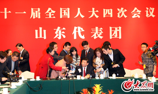 今天下午,十一屆全國(guó)人大四次會(huì)議山東團(tuán)對(duì)中外媒體開(kāi)放,吸引了75家中外媒體參加,在現(xiàn)場(chǎng),記者們紛紛舉起“長(zhǎng)槍短炮”,姜大明省長(zhǎng)成為現(xiàn)場(chǎng)提問(wèn)的焦點(diǎn)。大眾網(wǎng)記者抓住為數(shù)不多的機(jī)會(huì),向姜省長(zhǎng)提問(wèn):“姜省長(zhǎng),您在去年全國(guó)兩會(huì)的時(shí)候回答了大眾網(wǎng)友的十個(gè)問(wèn)題,今年一如既往地關(guān)注大眾網(wǎng)友,繼續(xù)回答了網(wǎng)友的提問(wèn),您如何看待現(xiàn)在網(wǎng)友通過(guò)網(wǎng)絡(luò)進(jìn)行問(wèn)政的現(xiàn)象?你認(rèn)為政府面對(duì)網(wǎng)絡(luò)問(wèn)政應(yīng)該采取什么樣的態(tài)度?”