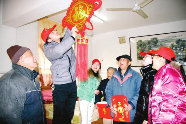 1月12日,淮北供電公司燕飛志愿者服務隊成員為市社會福利中心掛“中國結”。