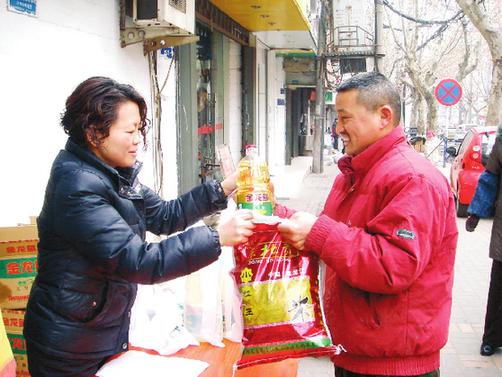 15日上午10時許,淮北市洪山社區的特困戶們來到了劉西峰的超市門口,幫忙搬運即將發放的慰問品。一桶油、一袋面、一袋米是劉西峰為困難戶準備的新年禮物。