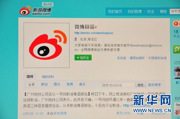 新浪微博專門開設(shè)的辟謠微博網(wǎng)頁畫面(6月4日攝)。新華社記者張逸之?dāng)z
