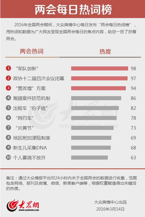 大眾網(wǎng)濟(jì)南3月14日訊(記者 王曉光 宋瑋瑋 劉洪)今天,大眾輿情中心發(fā)布第十三期“兩會(huì)每日熱詞榜”!败婈(duì)創(chuàng)新”“政協(xié)十二屆四次會(huì)議閉幕”“‘營(yíng)改增’方案”分別以98、97和94的熱度成為今日最熱詞。