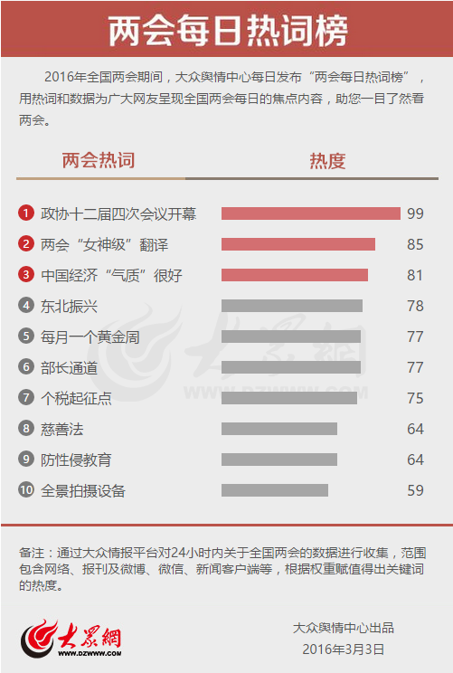 大眾網濟南3月3日訊 (記者 劉欣 劉洪 宋瑋瑋)今天,大眾輿情中心發布第二期“兩會每日熱詞榜”。“政協十二屆四次會議開幕”“兩會‘女神級’翻譯”“中國經濟‘氣質’很好”分別以99、85和81的熱度位居前三。