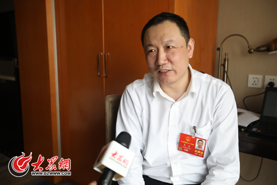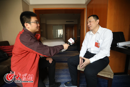 大眾網(wǎng)記者采訪全國人大代表、中國聯(lián)通濟(jì)南市分公司運行維護(hù)部經(jīng)理馬波。(亓翔 攝)