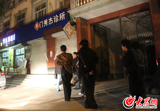 今天下午,大眾網記者來到本次摘腎案的事發地點——霸州市興華南路“門秀杰診所”前,只見這個診所占了一所沿街小樓的一部分樓體,一樓的卷簾門已經關閉,上面貼了霸州市公安局的4個封條,封條上面顯示的日期是9月24日,封條的旁邊還貼著“好消息,北京各大醫院預約掛號”等宣傳材料。記者注意到,一樓診所掛的名字是“門秀杰診所”,而在二三樓只見還有印了一個名字——“王英診所”。