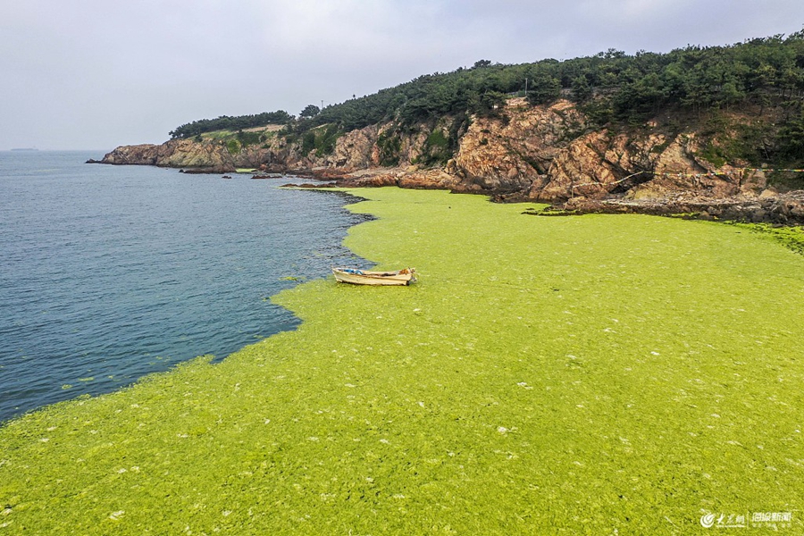 2019年7月2日,山東青島綠島灣一帶海域,海風將一波波飄移在海面上的滸苔送到海岸邊,不期而遇的滸苔云集,頓時染綠了海岸線。嚴陣以待的一只只青島“打滸隊”,將按照滸苔處置應急預案進行清理和收集工作。