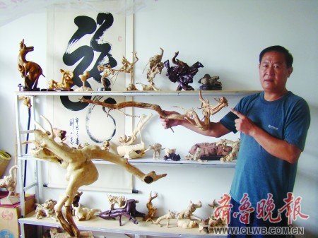 近日,張夏鎮退休職工王希武完成了他的大型根雕“十二生肖”,王希武一直癡迷于根雕藝術,該作品創作歷時多年,投入了大量精力,終于得以完成。圖為王希武手中拿著“十二生肖”中的“龍騰盛世”。