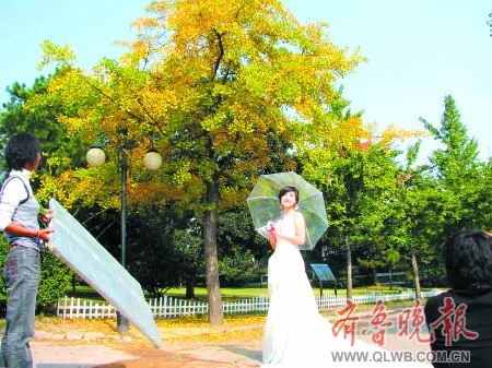 ▲19日,在青島八大關,新人們在一棵已經披上"黃金甲"的銀杏樹下拍照留念。專家預計,10月底到11月初將是島城今年銀杏樹的最佳觀賞期。 記者 胡希平 攝