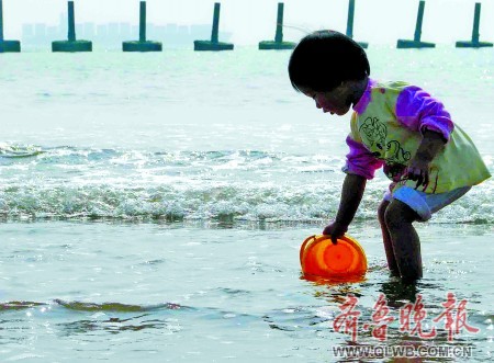 19日下午,一名兒童在青島第六海水浴場盡情玩耍。19日早晨的一場秋雨過后,太陽露出了笑臉,氣溫不但沒有下降反而明顯回升,市民來到海邊享受燦爛的秋天。 記者 楊寧 胡希平 攝