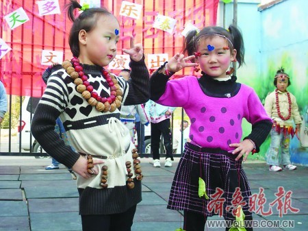 18日上午,泰安市御碑樓小學幼兒園辦起了“金秋廟會”,從小培養孩子熱愛家鄉的意識。圖為小朋友們戴著老師和家長幫他們用栗子、核桃、山楂等泰山特產做成的飾品,進行“時裝秀”表演。記者 侯海燕 攝影報道