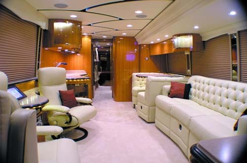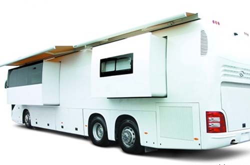 據(jù)悉,豪華房車的車廂長為13.7米,達(dá)到了目前國內(nèi)客車標(biāo)準(zhǔn)的極限,寬2.55米,高3.96米,足以容納媲美頂級別墅的各種功能空間,細(xì)節(jié)設(shè)計(jì)中無處不體現(xiàn)著現(xiàn)代豪宅理念。房車的客廳內(nèi)擺放著高級真皮沙發(fā)、42英寸大屏幕液晶電視和五星級家庭影院音響系統(tǒng),酒吧內(nèi)藏滿美酒,廚房內(nèi)微波爐、電磁灶、洗碗機(jī)、三門冰箱一應(yīng)俱全,可以在車上開辦最出彩的家庭派對。房車的主臥配備了寬敞舒適的女王大床,旁邊是視野廣闊的美景大窗、備有專為女主人準(zhǔn)備的走入式衣櫥。寬敞的浴室?guī)в欣錈崴到y(tǒng),門前布置了華麗的梳妝臺和洗衣、干衣機(jī)。為進(jìn)一步拓展房車內(nèi)部空間,主臥和客廳都有一個大型滑移倉可以向外滑移伸展。
