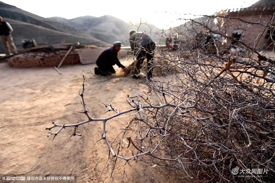 由于村里面的年輕人都出去打工了,剩下的多是老年人,村里的老漢們便提議成立起了老年協會,協會商量把今年的火龍駒活動放在62歲的村民高向向家。3月1日中午,62歲的高向向和幾位老伙計就來到山上的崖畔上砍圪針,夜幕降臨之時,幾名老伙計就已經將圪針放置在一起堆起來,準備點火。“圪針盡量是嫩芽,而且要求必須是正月廿三當天砍回來的,不能使用去年的舊柴。”高向向表示,跳火堆使用的柴火講究新鮮、干凈。