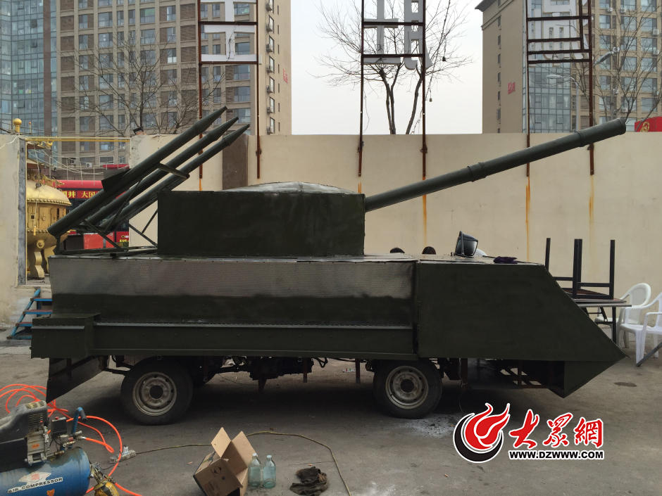 今天下午,在位于濟(jì)南明湖東路附近的一家燒烤店,“坦克燒烤車”的主人馮先生正忙著和工人一起為車輛做裝飾。馮先生告訴大眾網(wǎng)記者,他平時(shí)就喜歡動(dòng)手“搗鼓”一些東西,做燒烤生意后,他發(fā)現(xiàn)傳統(tǒng)的燒烤爐子油煙太大,經(jīng)常引來食客和附近住戶的“吐槽”,于是萌生了將爐子改造的想法。大約一個(gè)月前,馮先生開始著手設(shè)計(jì)這輛“坦克燒烤車”,如今終于成型。