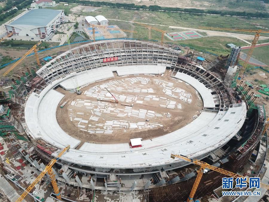 這是5月12日拍攝的柬埔寨國家體育場項(xiàng)目施工現(xiàn)場(無人機(jī)航拍)。 由中國政府援建的柬埔寨國家體育場項(xiàng)目主體結(jié)構(gòu)12日在柬埔寨首都金邊正式封頂。 新華社發(fā)(萬坡 攝)