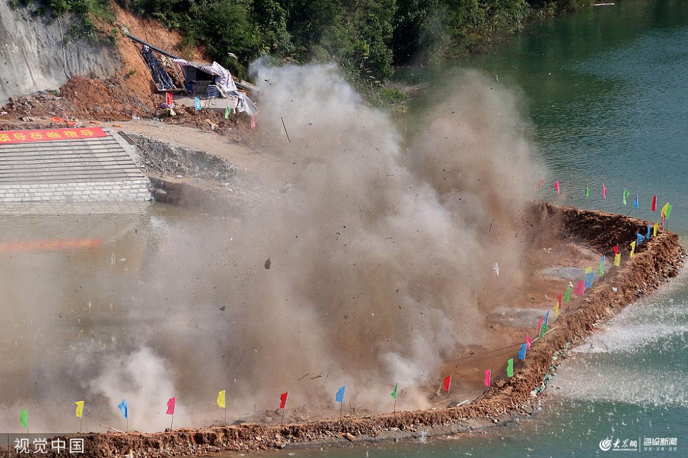 2019年7月23日下午3時(shí)40分,杭州,隨著一連串的悶響,千島湖配水工程進(jìn)水口圍堰完成爆破拆除。這意味著進(jìn)水口的水下部分已經(jīng)施工完成,具備了擋水能力,距離千島湖配水工程全線完工又邁出關(guān)鍵一步。