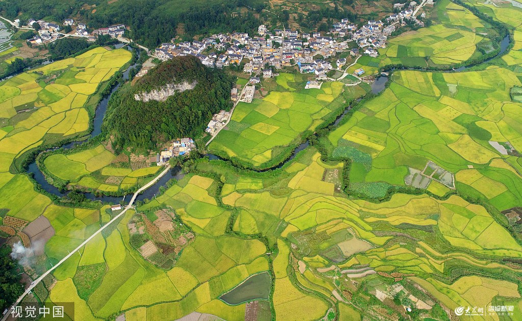 2019年9月4日,貴州省安順市平壩區(qū)高峰鎮(zhèn)巖孔村的初秋水稻。空中俯瞰,一座座山巒與泛黃的田野、彎曲的河流、古樸的布依族村寨融為一體,構(gòu)成一幅幅美麗的秋色田園風(fēng)光。