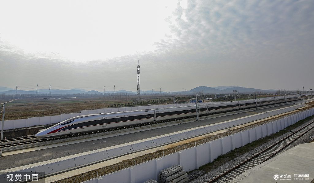 山東臨沂,日蘭高鐵的首段線路,即魯南(日蘭)高速鐵路日照-臨沂-曲阜段線路將率先開通運營,復興號列車駛經平邑縣蒙山站。