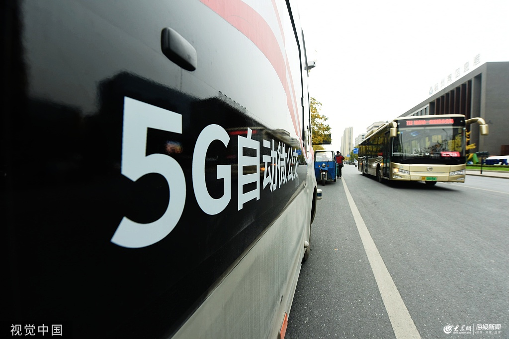 在杭州市蕭山區(qū)道路上,一輛公交車從5G無(wú)人駕駛微公交邊上駛過(guò)。