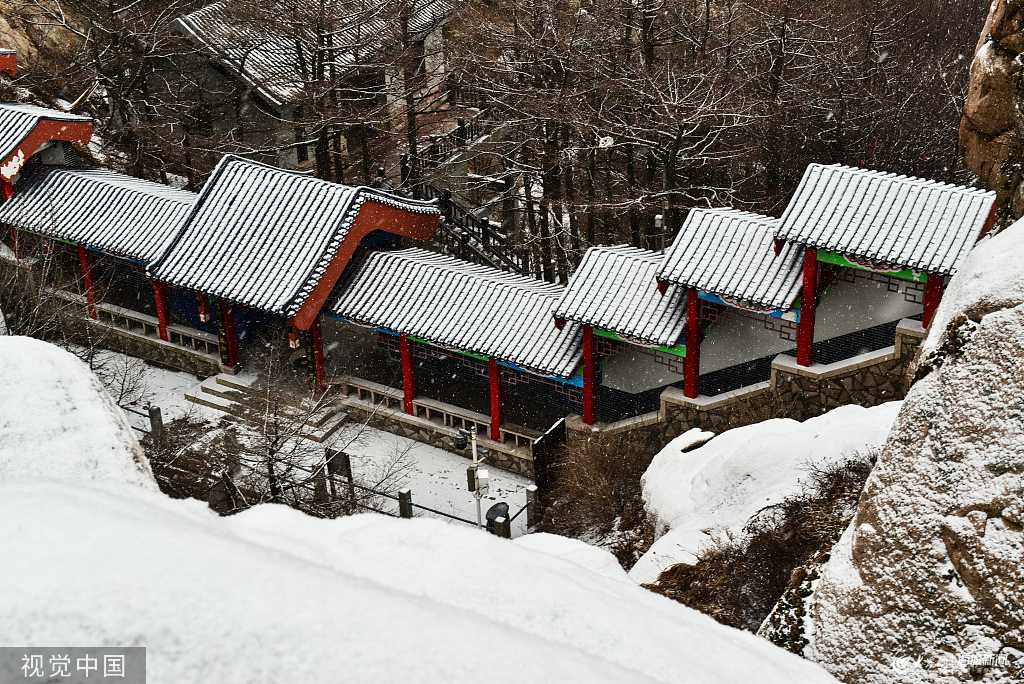 2019年11月30日,青島嶗山巨峰迎來了2019年第一場冬雪。洋洋灑灑間,玉樹瓊枝、粉雕玉琢,于錯落有致的雪色群山中。