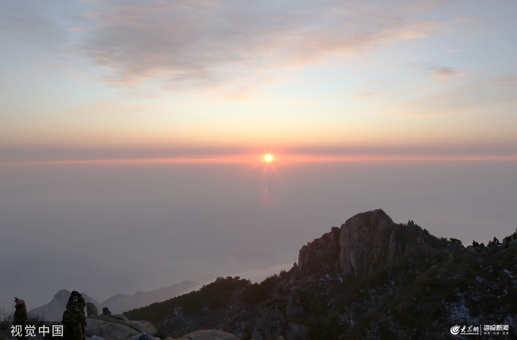 2019年12月8日,山東泰安,初冬的泰山景色別致,吸引了眾多游客前來游玩。圖為泰山山頂?shù)娜粘鍪⒕啊?