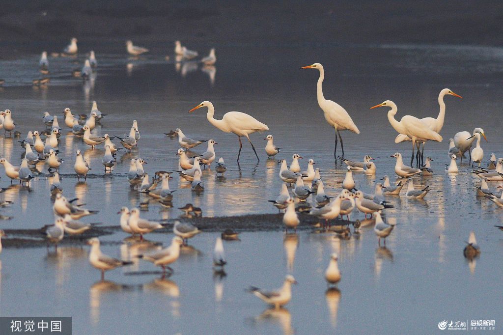 2019年12月9日,在青島市城陽(yáng)區(qū)河套濕地,大白鷺與紅嘴鷗結(jié)群覓食,安然越冬。